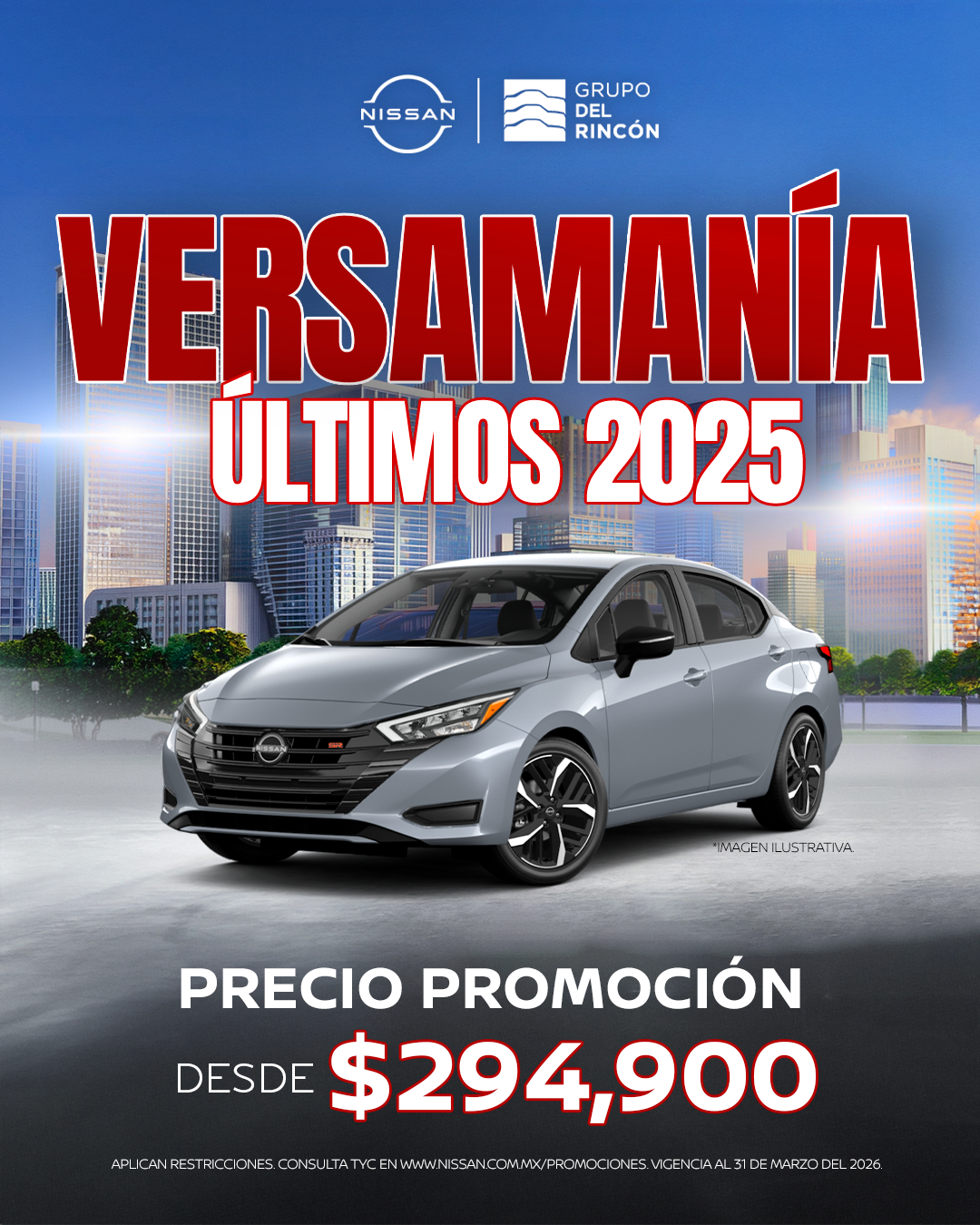 Últimos Nissan Versa 2025 con precio promoción. Vigencia al 31 de marzo del 2026. *Aplica restricciones.